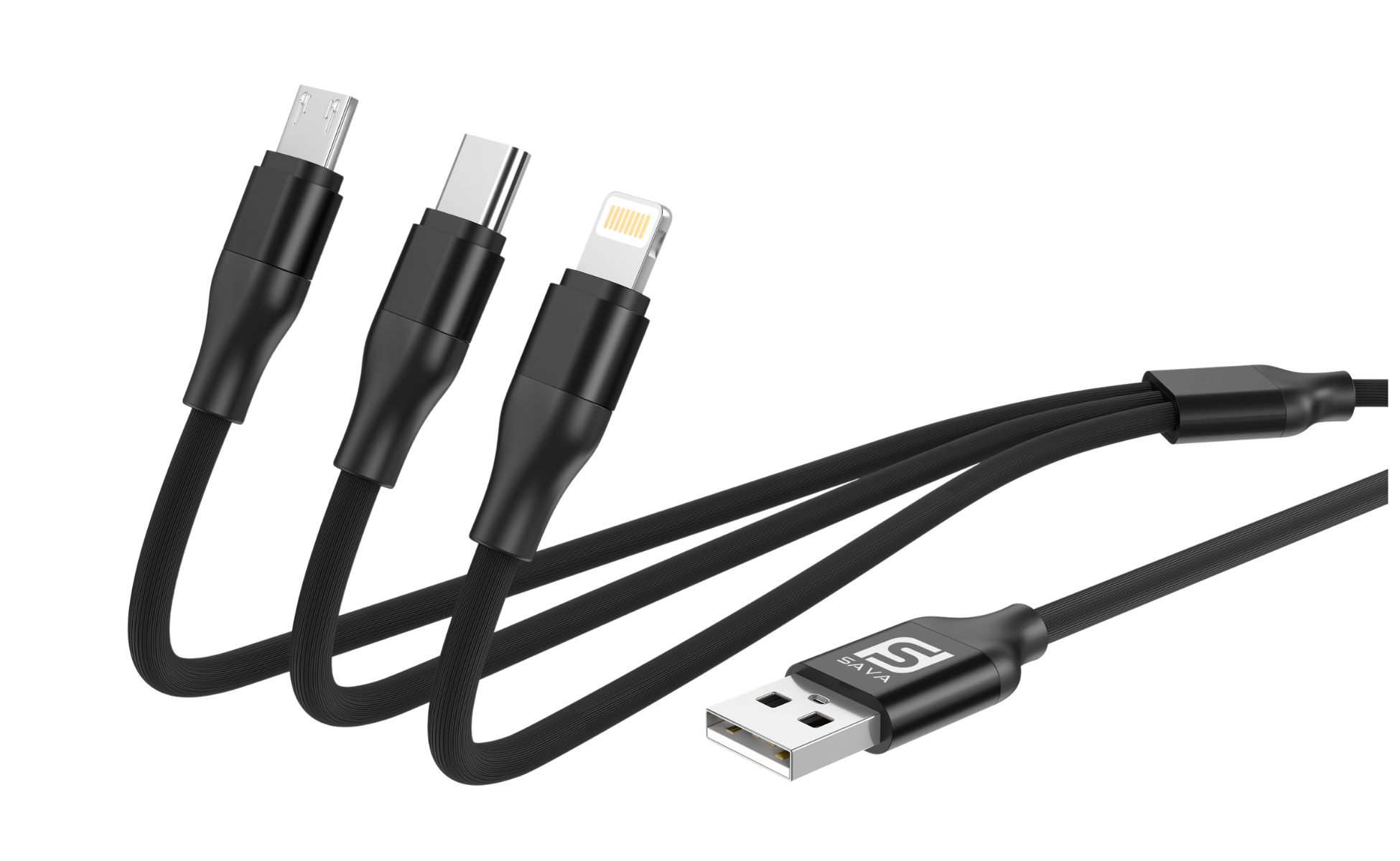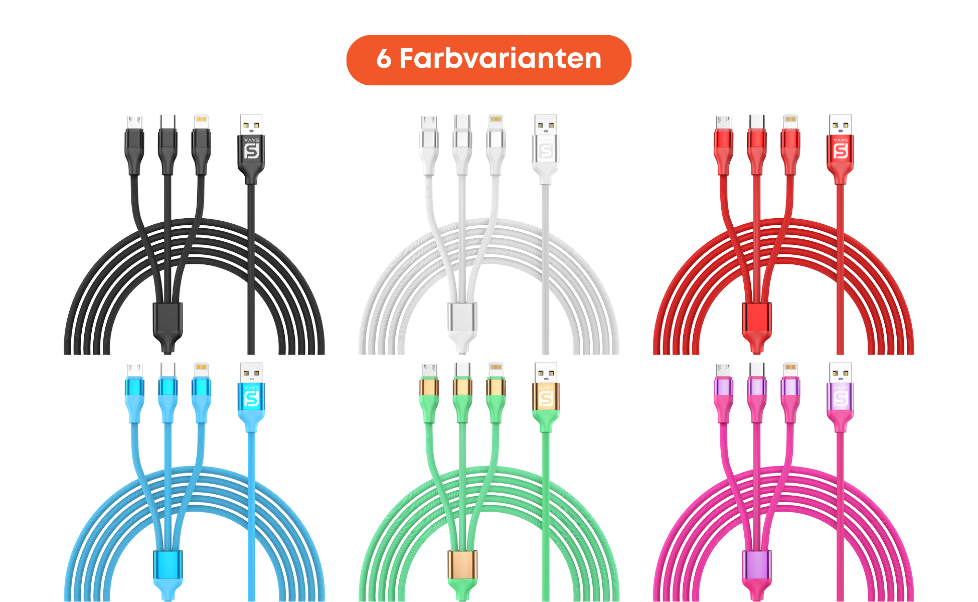 USB-A 3-in-1 Kabel mit Micro USB, USB-C und Lightning in verschiedenen Farben. Ideal für Smartphones, iPads und andere Geräte.