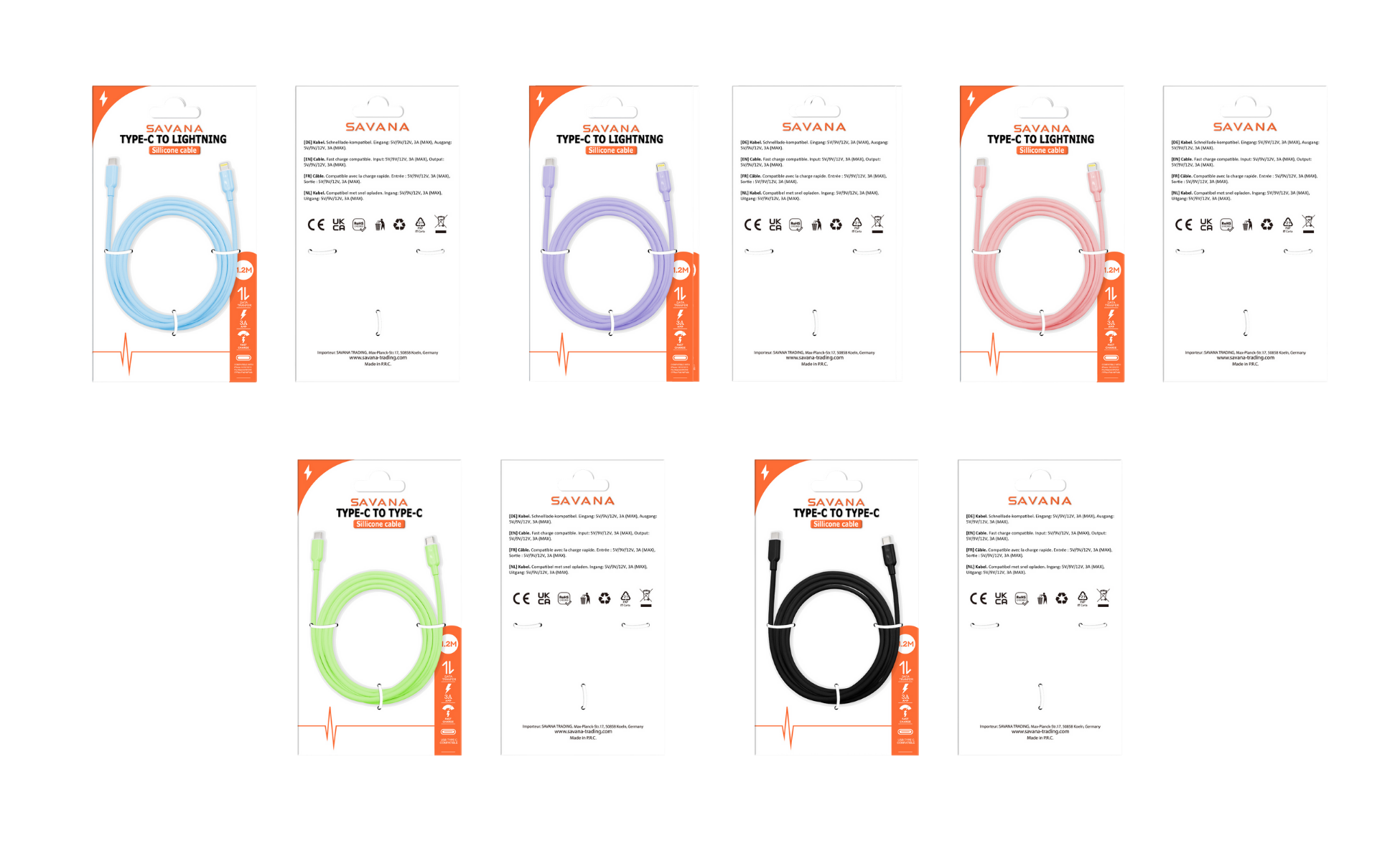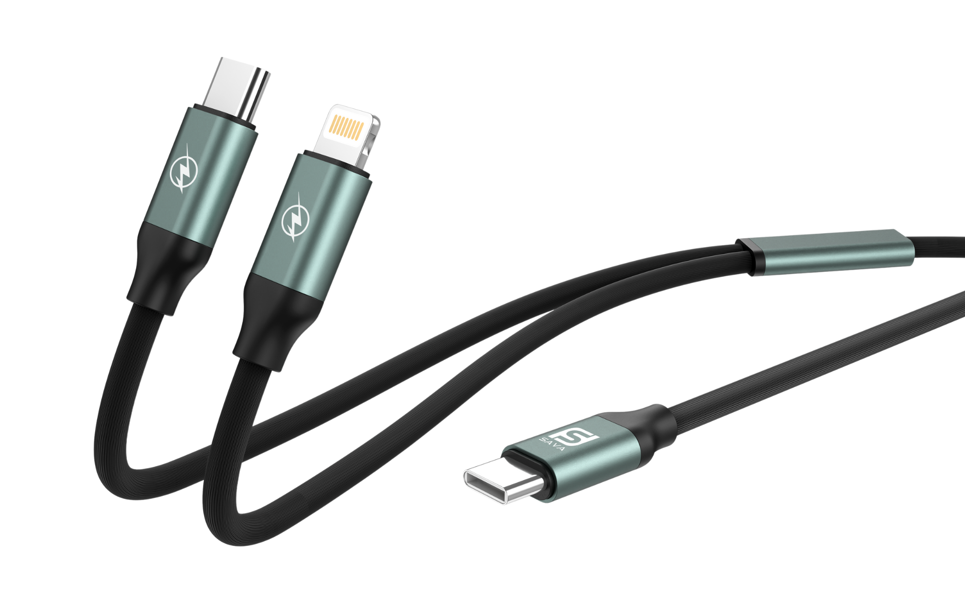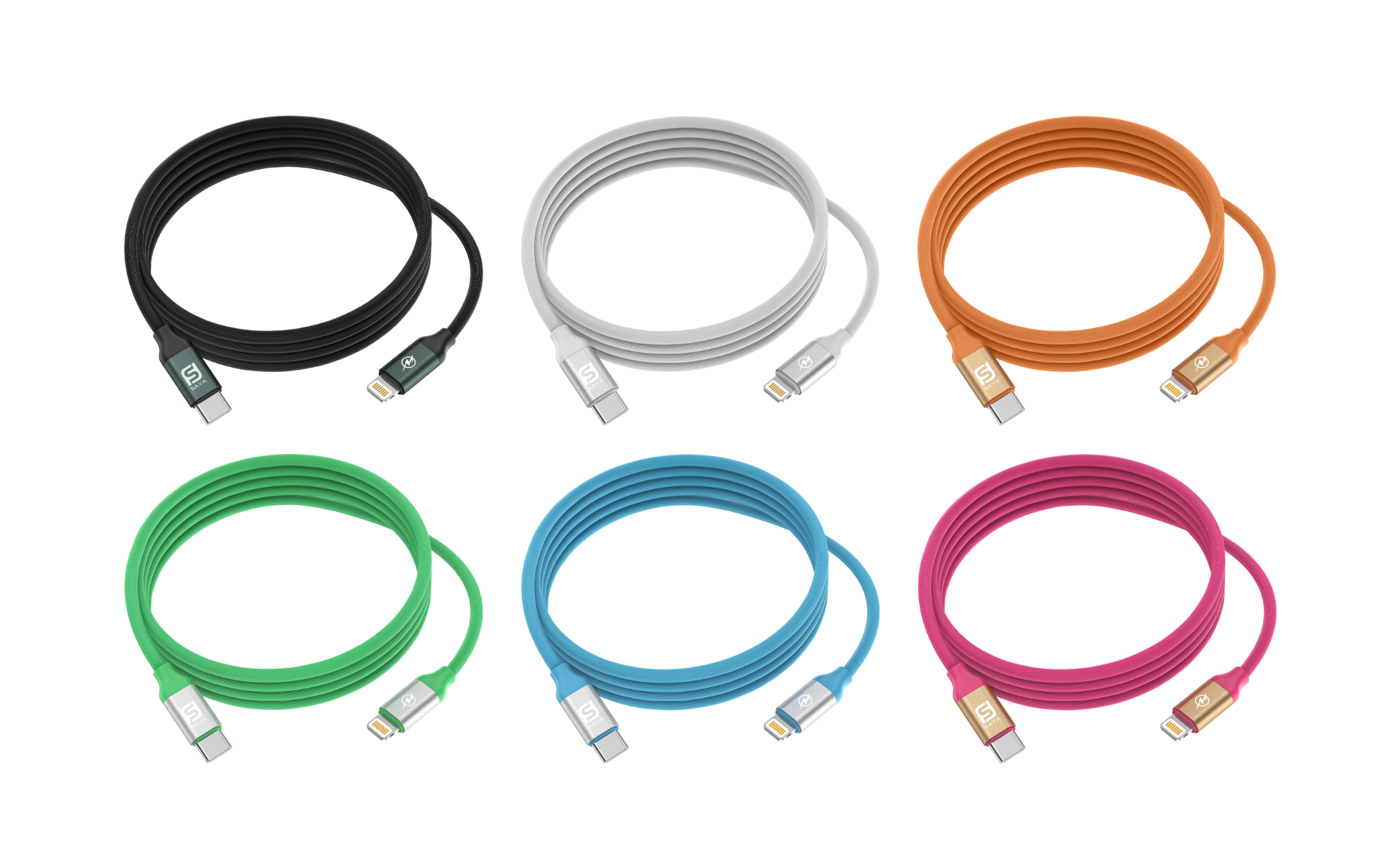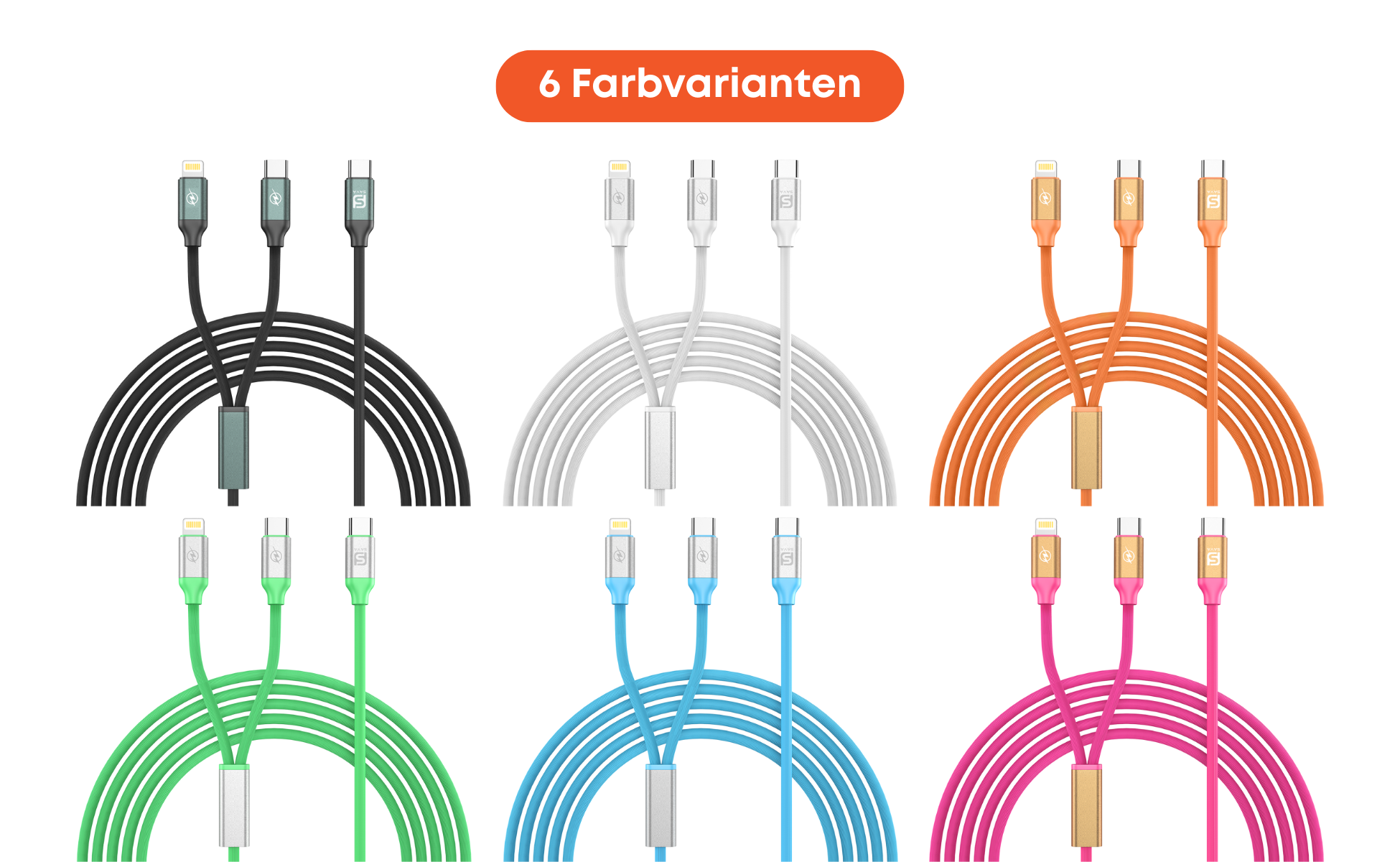 USB-C 2-in-1 Kabel mit USB-C und Lightning in verschiedenen Farben. Geeignet für Smartphones, iPads und andere Geräte.